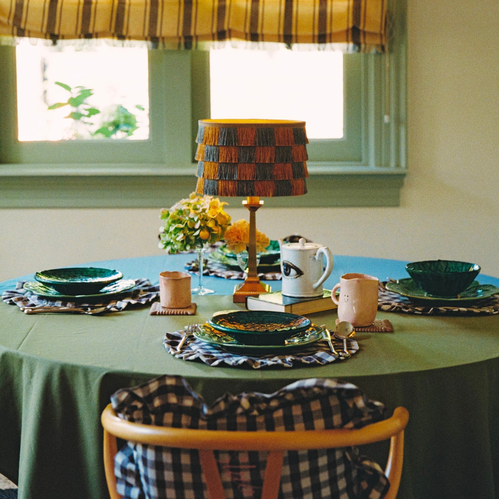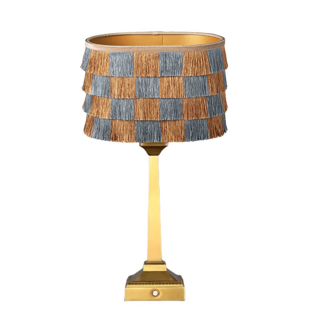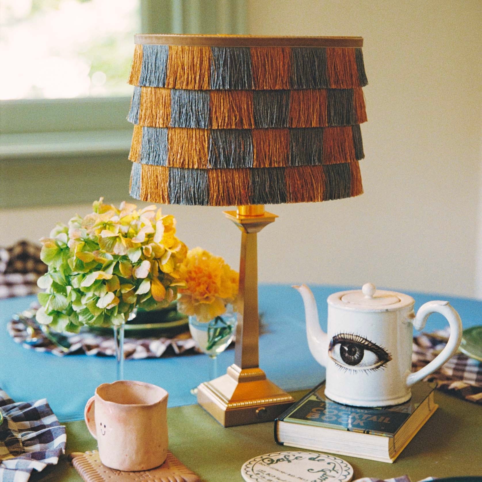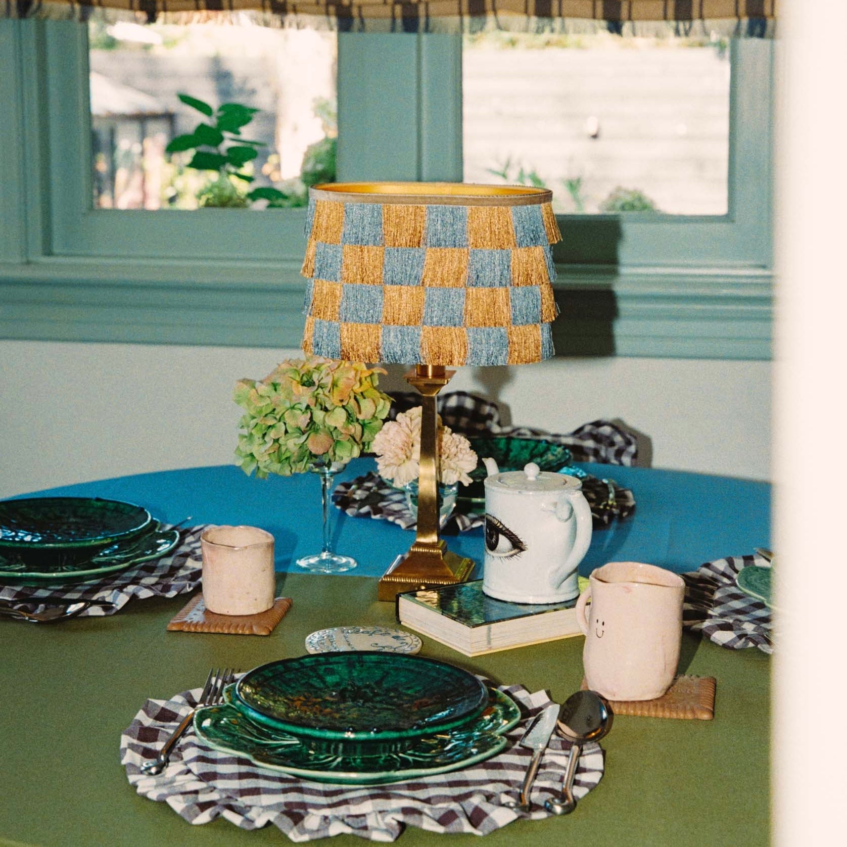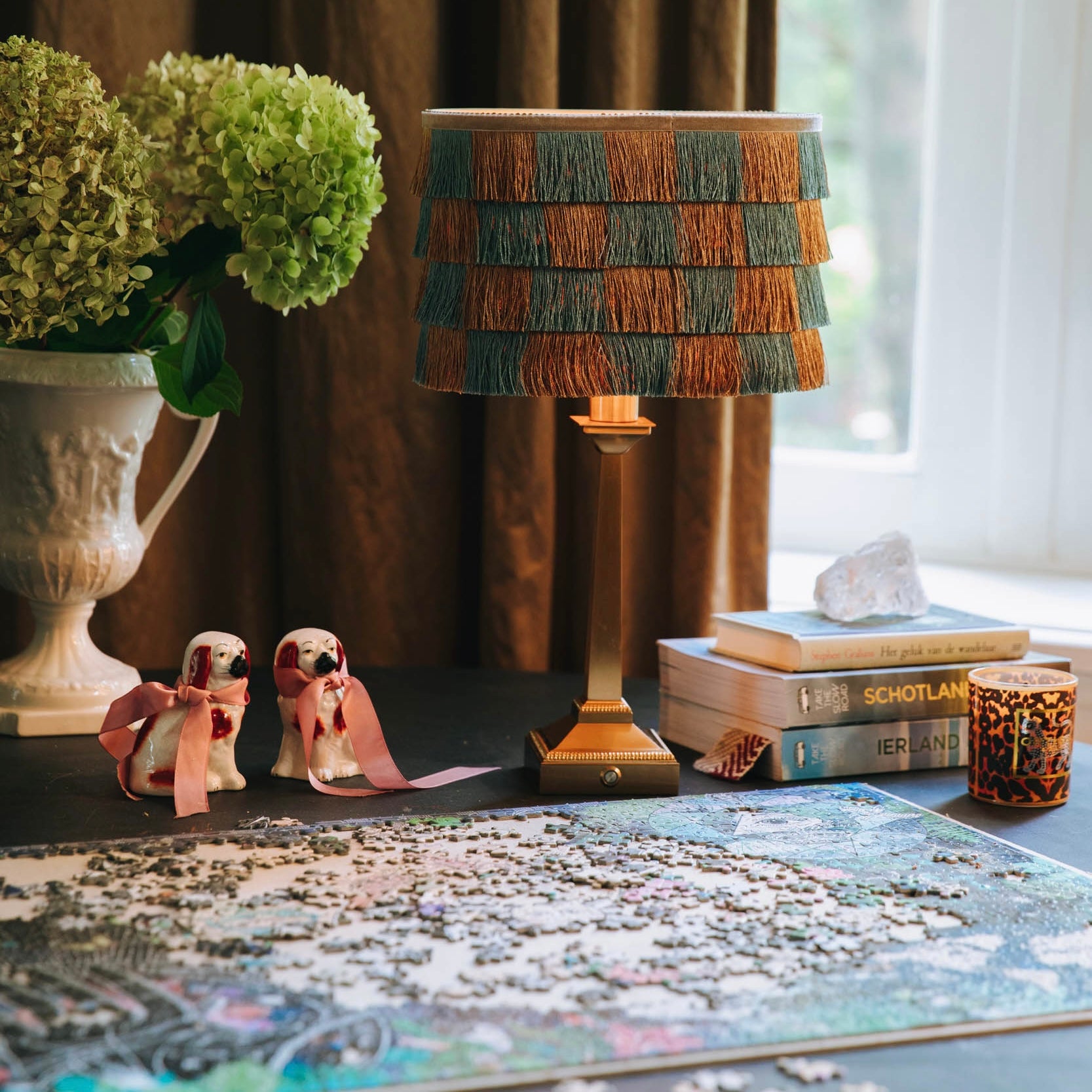 Club Carlotta's Charlie lampbase rechargeable, cordless design adds freedom and atmosphere wherever you place her. With a dimmable light, solid feel, and up to 30 hours of glow on a full charge, she’s made for quiet evenings, long dinners, or soft light by the window. The Palais Giselle Caramel & Dusty Blue lampshade adds a playful yet elegant touch with its soft checkerboard pattern in caramel and dusty blue, finished with a warm gold inner lining that casts a gentle, inviting glow.