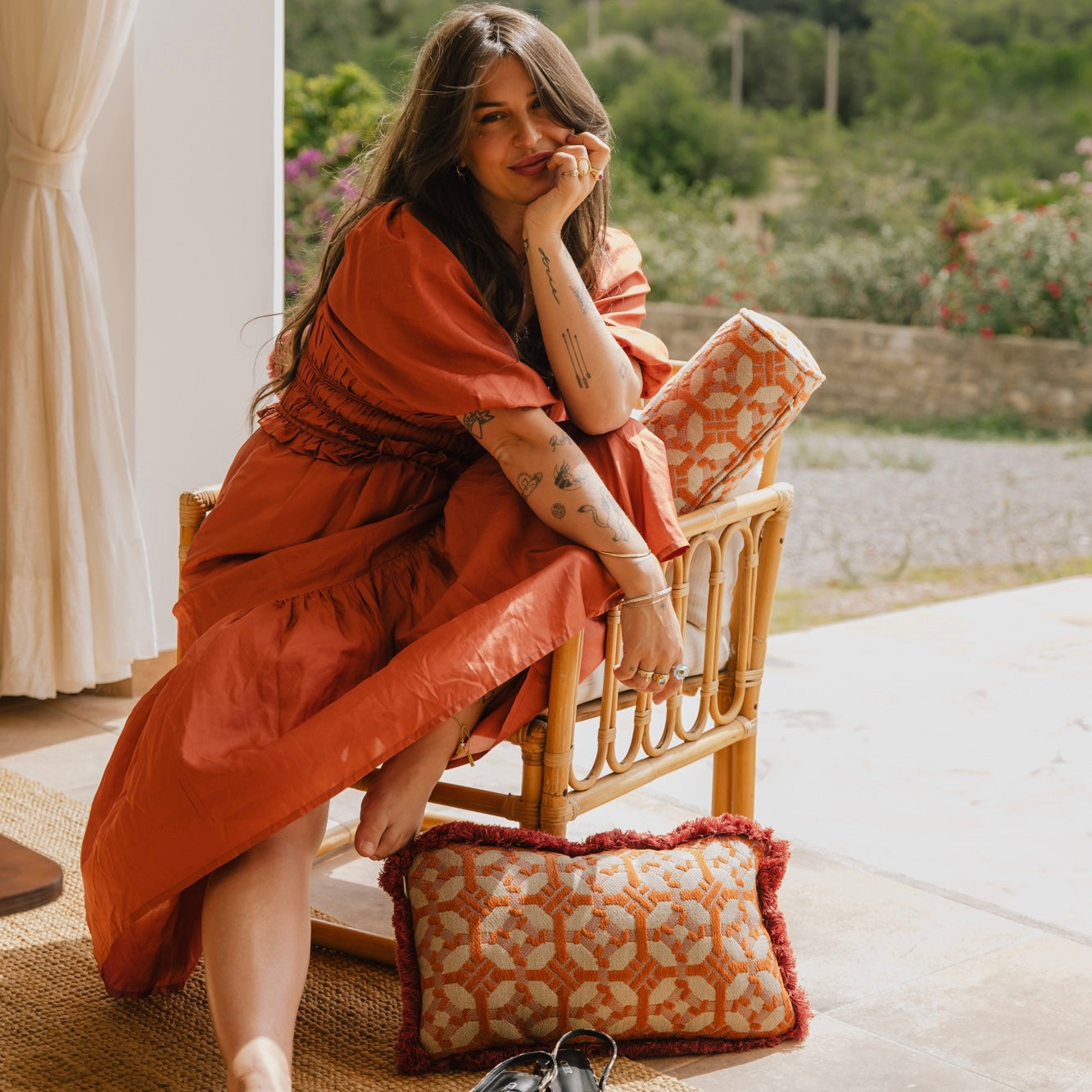 Cushion with an orange and pink geometric pattern, measuring 50x30 cm, made from water-repellent fabric, perfect for stylish and versatile indoor and outdoor seating.