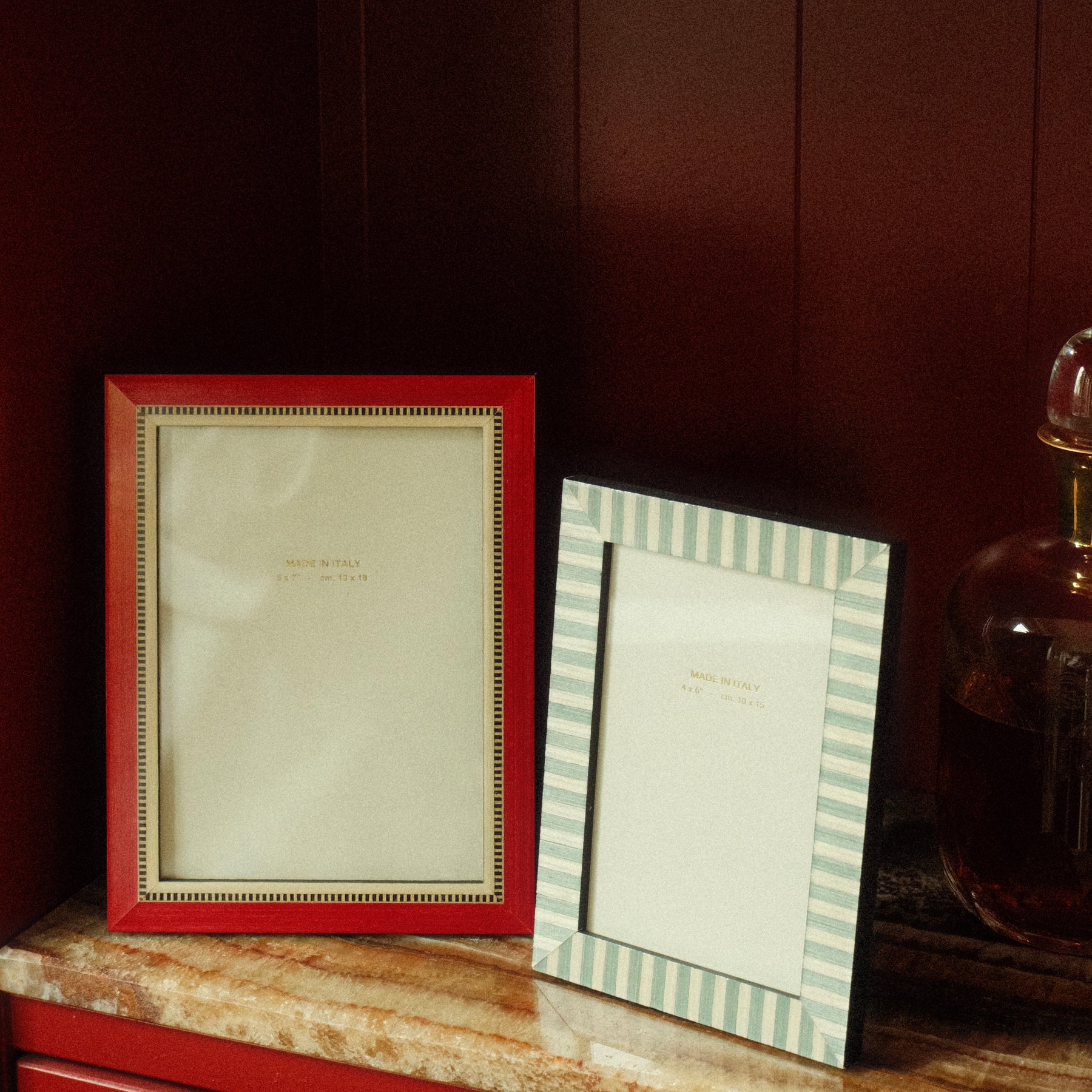 Each frame is handcrafted in Italy using the traditional marquetry technique. With this technique, small pieces of wood are carefully cut and placed together to create a unique and refined pattern. This detailed process gives every frame its own character, making each piece truly one of a kind. Known for its precision, artistry, and timeless elegance, marquetry adds a distinctive and luxurious finish to every piece. Finished with a high-gloss coating that enhances the colours and gives each frame an elegant shine. Designed for freestanding use only.