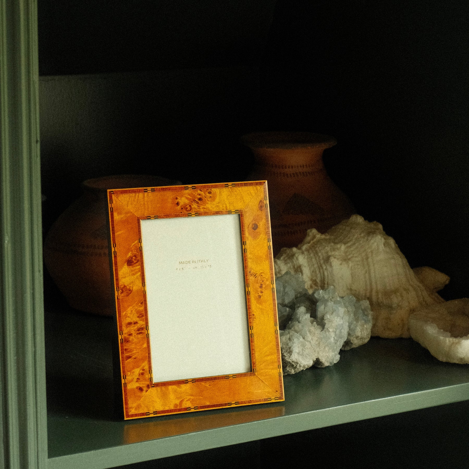 Each frame is handcrafted in Italy using the traditional marquetry technique. With this technique, small pieces of wood are carefully cut and placed together to create a unique and refined pattern. This detailed process gives every frame its own character, making each piece truly one of a kind. Known for its precision, artistry, and timeless elegance, marquetry adds a distinctive and luxurious finish to every piece. Finished with a high-gloss coating that enhances the colours and gives each frame an elegant shine. Designed for freestanding use only.
