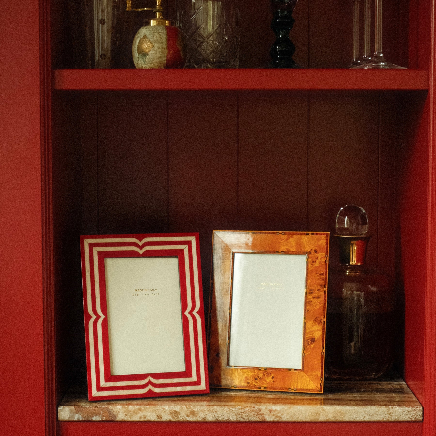 Each frame is handcrafted in Italy using the traditional marquetry technique. With this technique, small pieces of wood are carefully cut and placed together to create a unique and refined pattern. This detailed process gives every frame its own character, making each piece truly one of a kind. Known for its precision, artistry, and timeless elegance, marquetry adds a distinctive and luxurious finish to every piece. Finished with a high-gloss coating that enhances the colours and gives each frame an elegant shine. Designed for freestanding use only.