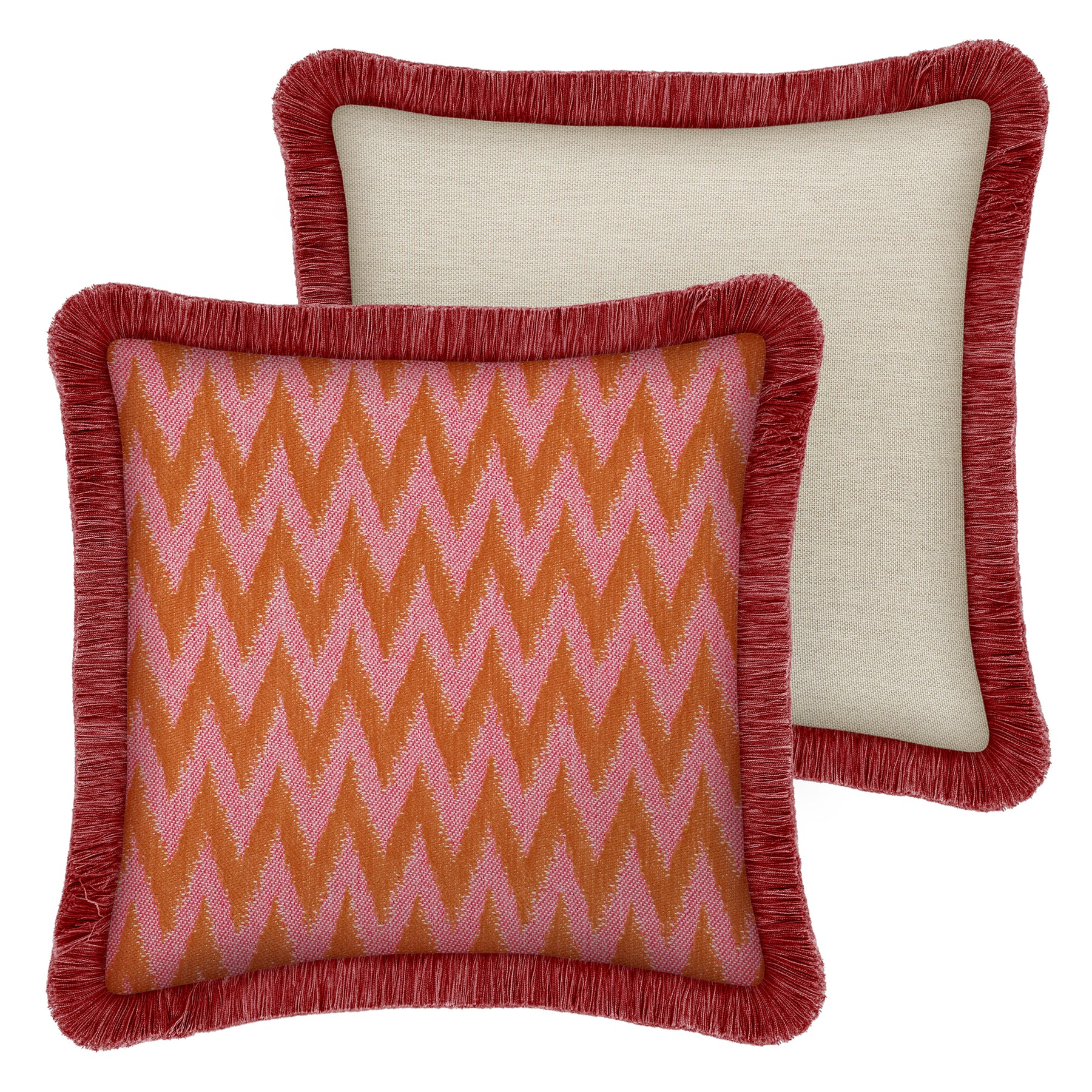 Cushion with a pink and orange zigzag pattern, measuring 45x45 cm, made from water-repellent fabric, perfect for stylish and versatile indoor and outdoor seating.