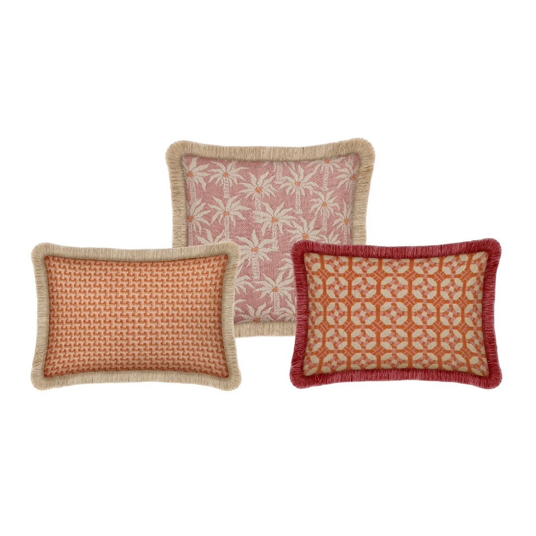 Doordrenkt met retro charme combineert de Peachy Bloom Set zonvervaagde palmen, geweven terracotta texturen en uitgesproken geometrie in zachte perzikkleuren. Het is een speelse ode aan bloeiende landschappen en ontsnappingen tijdens het gouden uur – warm, dromerig en met een vleug nostalgie. Deze set bevat: