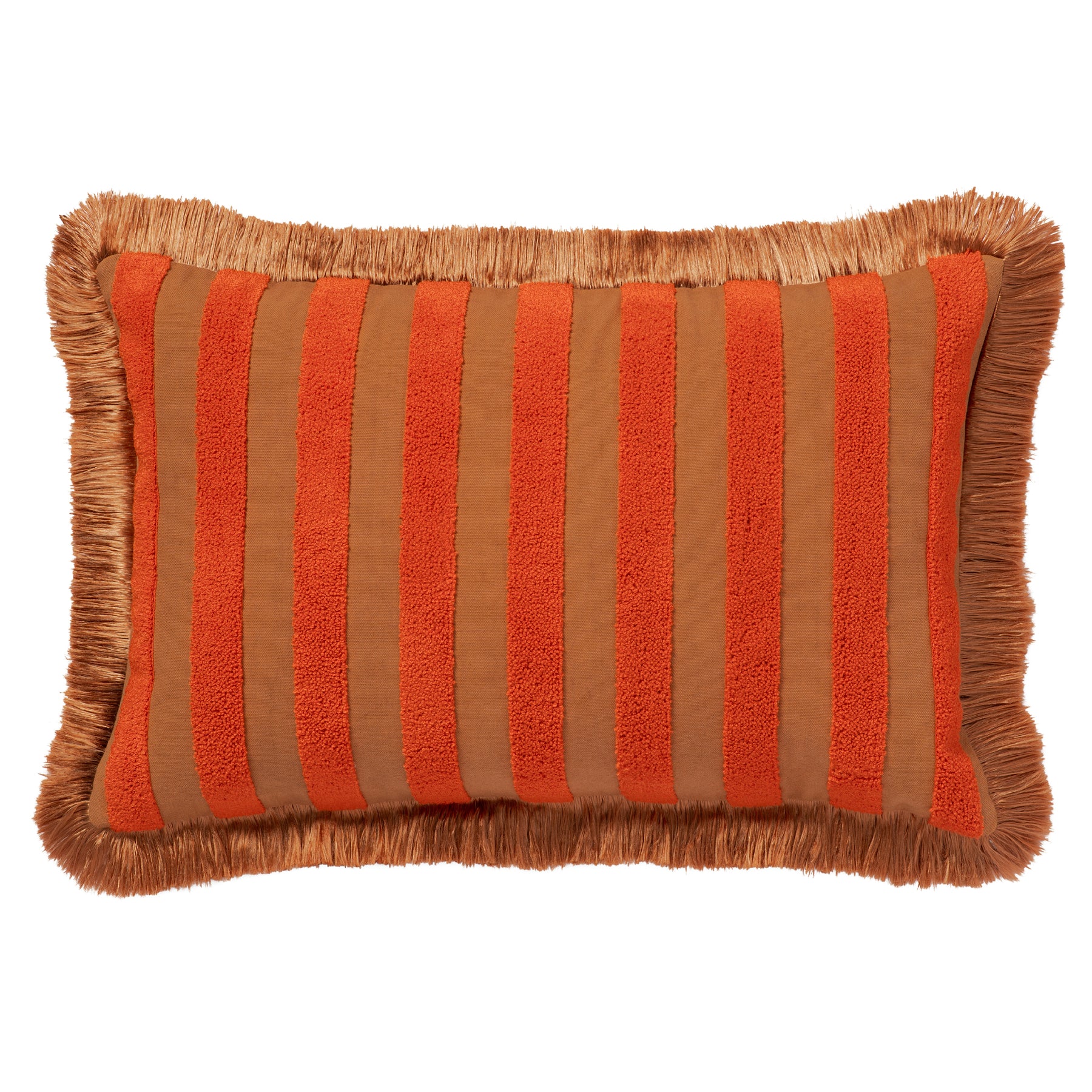 Rectangular decorative cushion with orange and brown stripes and fringe, 60x40 cm accent pillow for sofa or bed