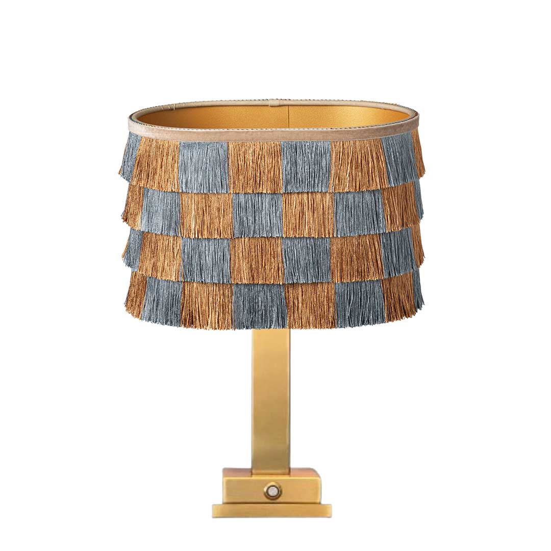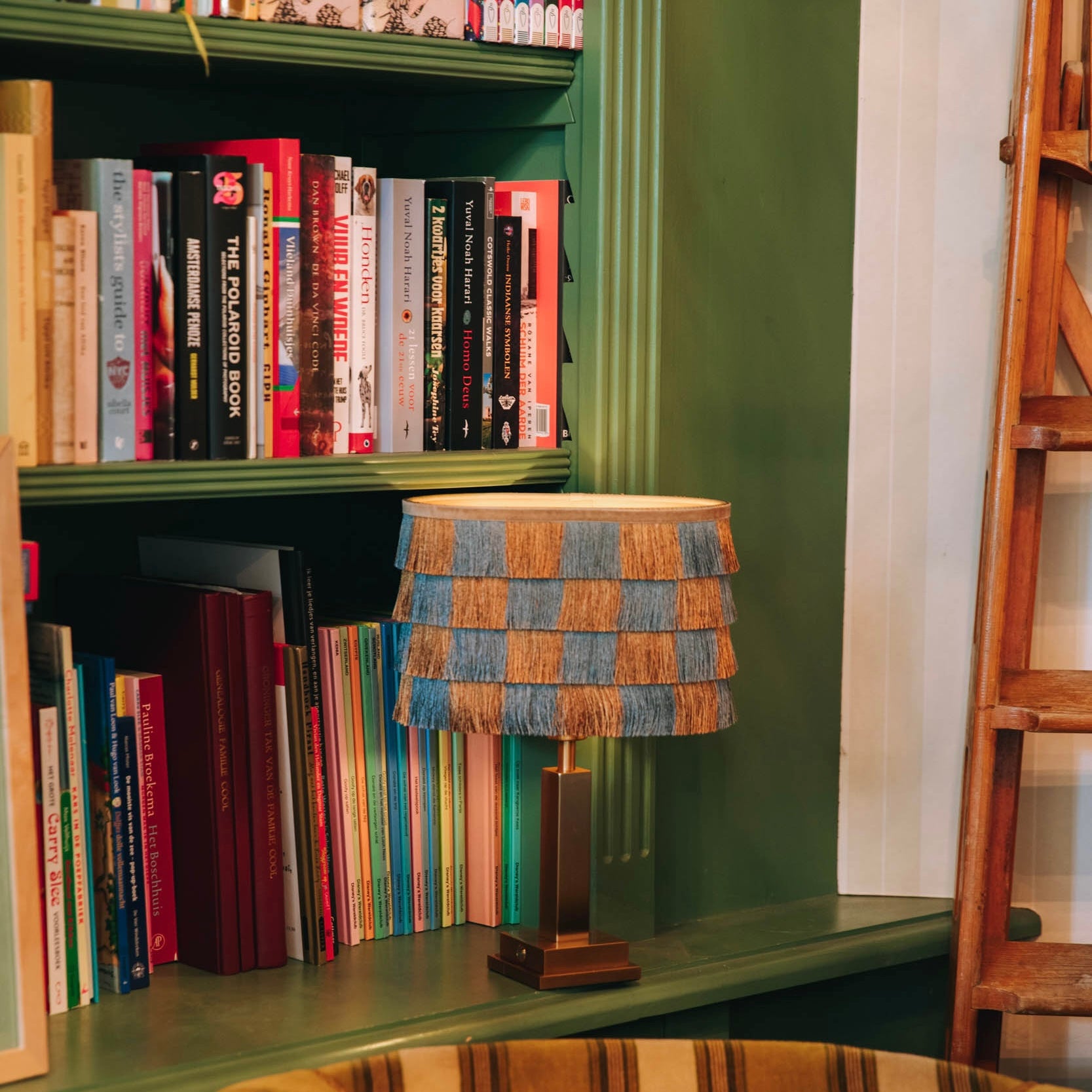 Club Carlotta's Philia lampbase rechargeable, cordless design adds freedom and atmosphere wherever you place her. With a dimmable light, solid feel, and up to 24 hours of glow on a full charge, she’s made for quiet evenings, long dinners, or soft light by the window. The Palais Giselle Caramel & Dusty Blue lampshade adds a playful yet elegant touch with its soft checkerboard pattern in caramel and dusty blue, finished with a warm gold inner lining that casts a gentle, inviting glow.
